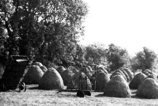 There are many examples of photographs which record a rural way of life or an occupation which no longer exist. An interesting photograph is that of haymaking which was taken near Waringstown. Mr Gracey describes how the metal cage in the photograph was used to make these perfect haycocks, by putting it under the elevator to be filled with hay and then turned over.