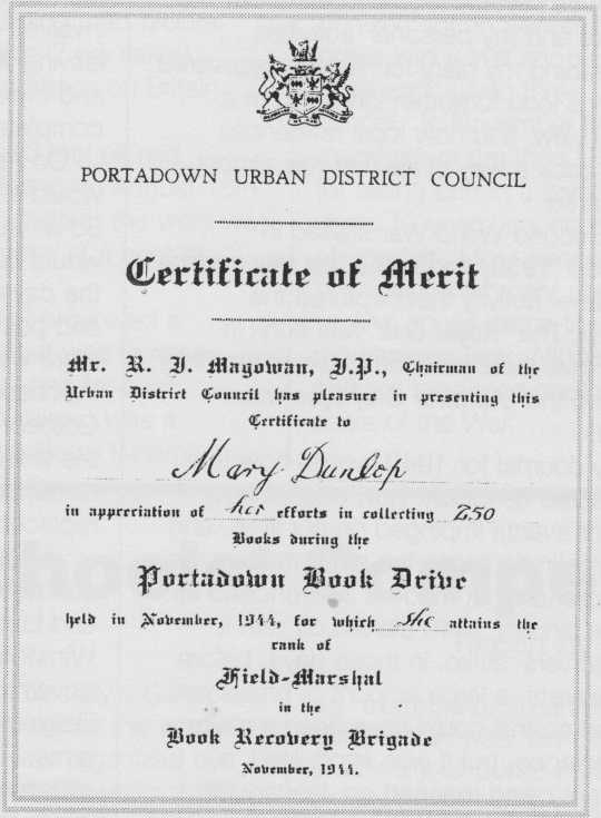 One was a 'Certificate of Merit' issued in November 1944 by Portadown Urban District Council and presented by the then Chairman, Mr R J Magowan, for having collected 250 books during the Portadown Book Drive and for which I reached the rank of 'Field Marshall Recovery Brigade. I have no idea what the books were being collected for - probably for recycling the paper - but I do recall that, even at that age, I couldn't bear to part with all of them and did hoard quite a number, for which instinct I was thankful in later years. I also remember the 'bun fight' in the Town Hall at which we high ranking officers were presented with our awards!