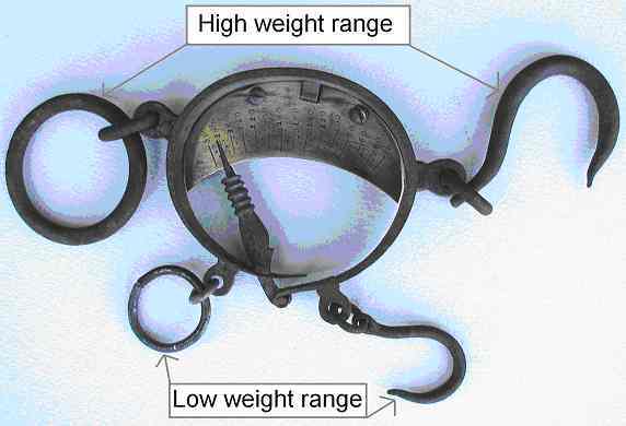 The scales, which is what they are, are only 11"x 5" (275mm X 125mm) yet they can weigh up to 300 lbs (130kg) on the large ring and hook; using the small ring and hook they can go up to 45 lbs (20kg). The pointer is double and can indicate whichever range is being used.