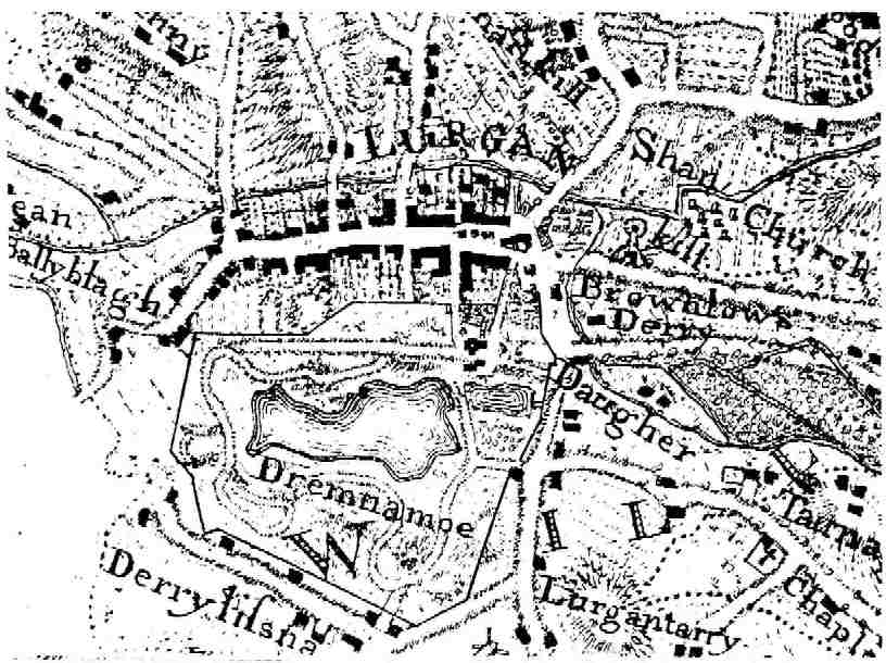 The final illustration is of Lurgan, enlarged to about 3.5" to the mile (Eng). It connects me and my experience with John Rocque's time. The lettering runs from South to North. The straight track between the town and the lake is still there now, with its ends joined by a curved circuit next the lake. A short-cut from near the South end of the straight presently links it to the iron bridge and culvert by the lake corner.