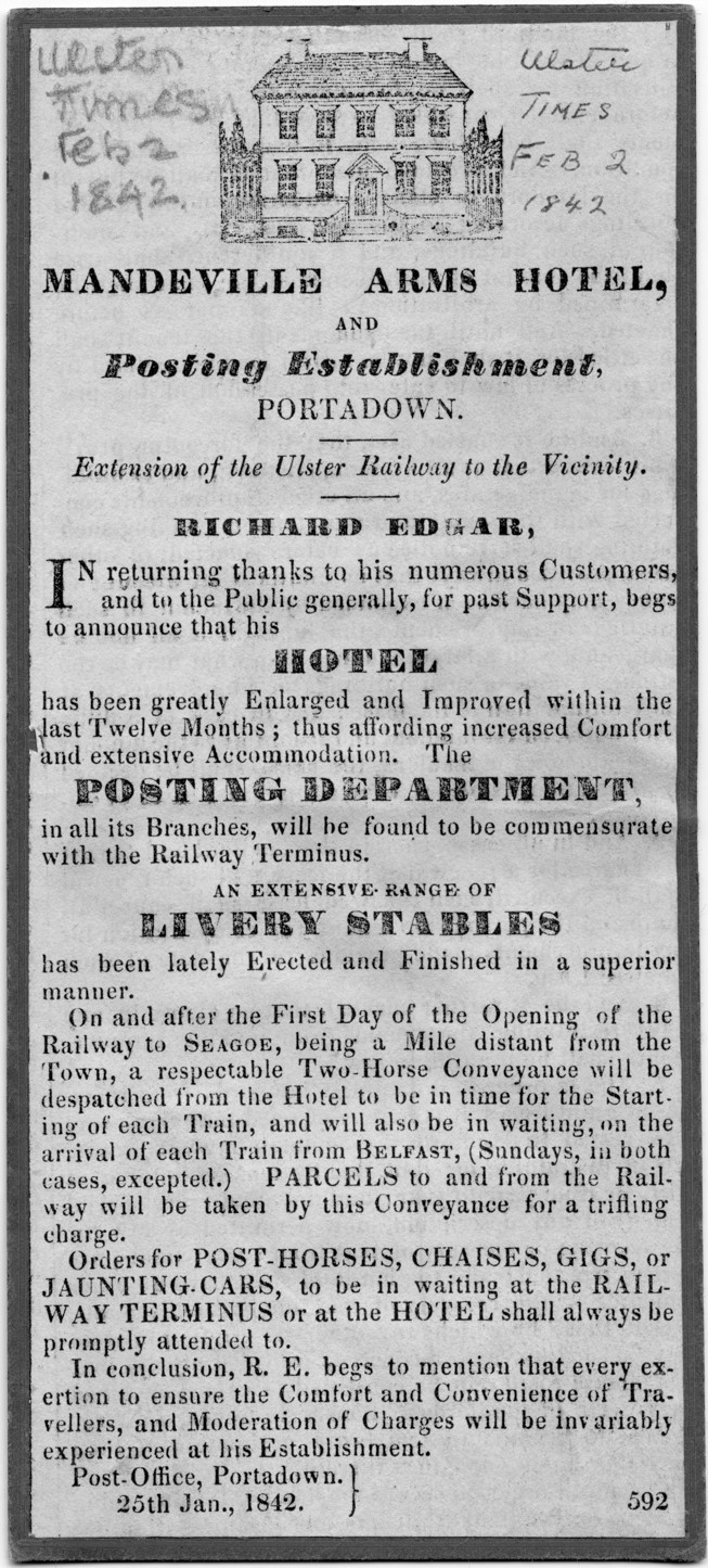 More than a hotel, the Mandeville Arms occupied a central part in the life of Portadown. Taking advantage of the arrival of the Ulster Railway from Belfast in 1842, Richard founded a posting establishment within the hotel. By 1846 Richard had successfully established the Mandeville Arms as the town’s central post office with Slater’s National Commercial Directory of Ireland recording Richard as the town’s “Post Master” and that “Letters from DUBLIN and all parts of the SOUTH OF IRELAND, also from ENGLAND, arrive every morning at seven, and are despatched every evening at a quarter before seven.- Letters from BELFAST and all parts of the NORTH OF IRELAND, also from SCOTLAND, arrive every night at twenty past ten, and are dispatched every night at half past nine.- Letters from ENNISKILLEN and all parts of the WEST arrive morning at two, and are despatched every night at half-past nine.”11