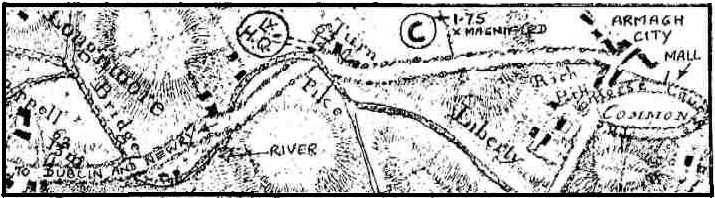 But let us return to his first map.... he misnames Richmount, near the present Scotch St. filling station, as Richhill, and simply disappears the village of that name. He translates the river Tall from its valley between the Diamond and Crowhill (close by my home) to a line nearly a mile to the South of its course, so that it no longer passes under the Cushenny road at Cushenny Bridge, rendering that bridge redundant. The road over the Diamond Hill towards Crowhill has been spirited away. Since he has stolen the road and moved the river, he has also made away with our Redmond's Bridge, a very serious offence.