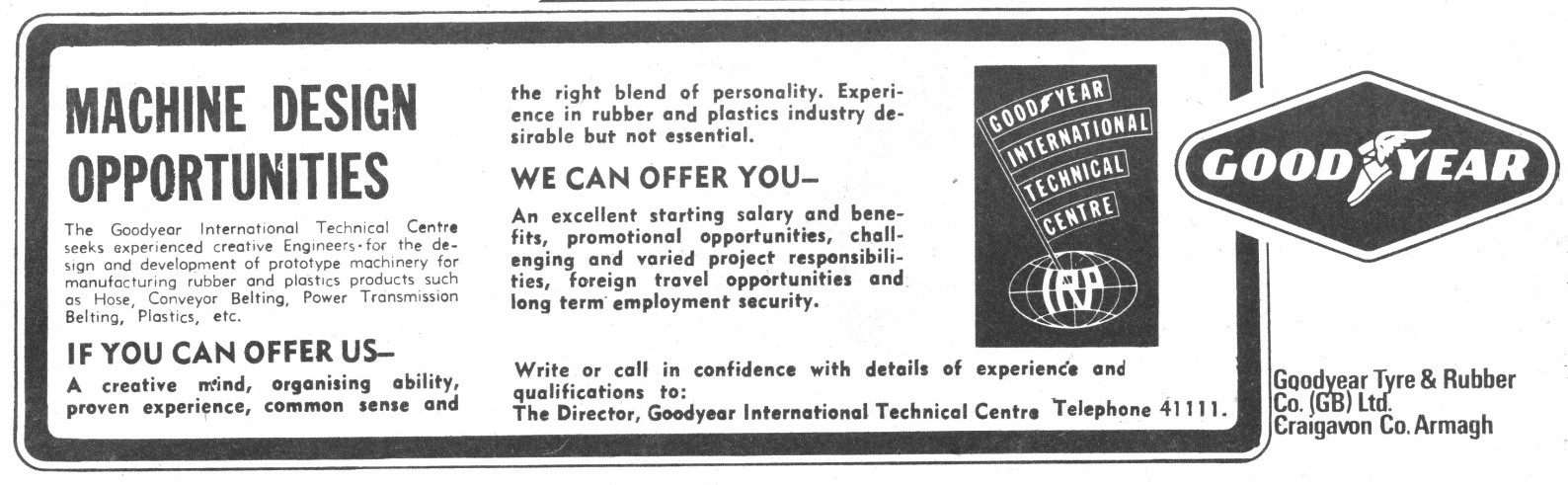 The main reason why the Goodyear Tyre and Rubber Company set up an ‘industrial rubber products’ factory in the new city of Craigavon was to accommodate the expansion of their tyre factory in Wolverhampton.